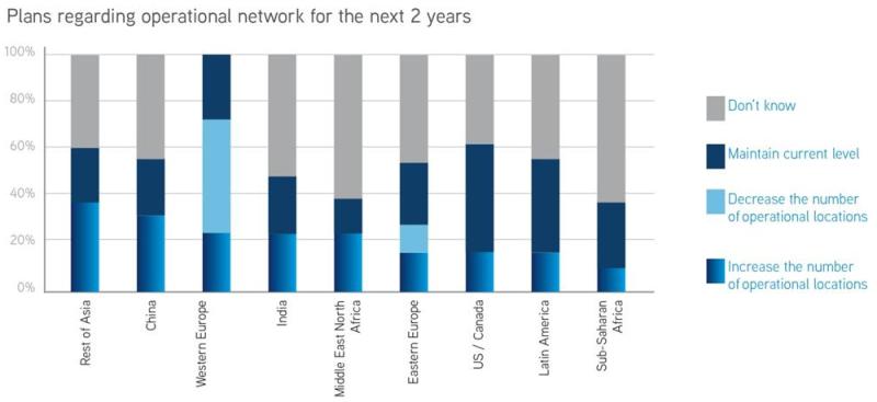 Naopak postoj globálních ekonomických hráčů vůči západní Evropě prokazuje její aktuálně výrazně menší atraktivitu. Více než 45 % dotázaných společností totiž očekává snížení úrovně svých aktivit všeho druhu právě na tomto kontinentu, respektive jeho části, zatímco expanzi na tomto teritoriu plánuje jen 23 % účastníků ankety.