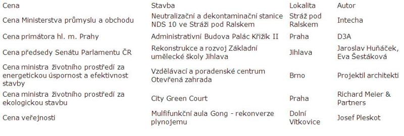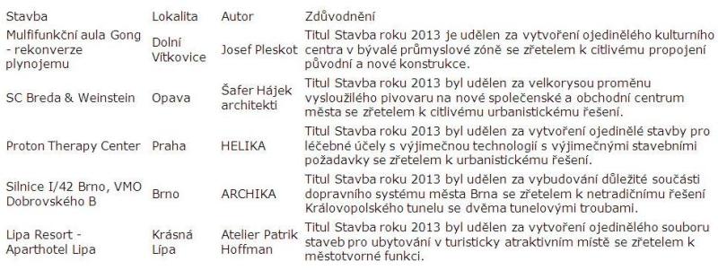 Stavbami roku 2013 jsou ostravská aula Gong, společenské a obchodní centrum Breda & Weinstein v Opavě, Proton Therapy Center v Praze, Lípa resort – Aparthotel Lípa na Děčínsku a Královopolské silniční tunely v Brně. Výsledky vyhlásila ABF – Nadace pro rozvoj architektury a stavitelství, která soutěž organizuje. Porota v čele s architektkou Radomírou Sedlákovou letos vybírala z 54 přihlášených projektů, dva z nich byly zahraniční. Do finále letošního 21. ročníku soutěže se probojovalo 16 z nich. Letošní Osobností stavitelství byl zvolen poradce ve věcech řízení výstavby a stavebnictví Miroslav Hegenbart. Stejně jako v předchozích letech byl i letošní ročník určen pro všechny objekty bez rozlišení druhu stavby nebo výše nákladů vynaložených na její pořízení. Podmínkou pro přihlášku do soutěže bylo dokončení a uvedení do provozu nebo zkolaudovaní v období od června 2012 do letošního května.