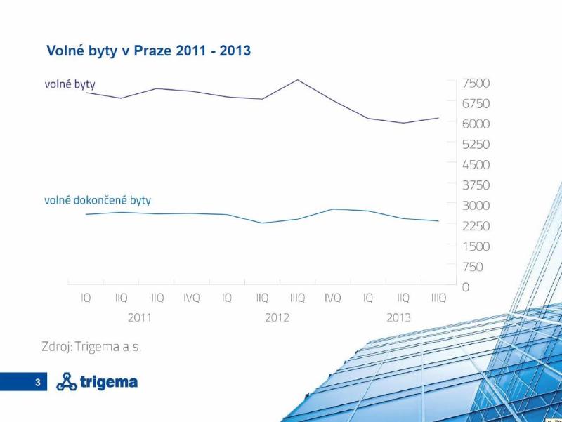Skutečností nicméně je, že pro profesionály kombinace a porovnání všech dostupných údajů nepochybně vytváří dosti přehledný a nyní už i dostatečně plastický obraz skutečnosti. (Ten by od 1. ledna měly ještě rozšířit statistiky katastru, které budou mj. sledovat realizované ceny.) Evidentní je i to, že právě analýzy Trigemy na první pohled nepřinášejí moc dobrých zpráv: byty jsou dražší než tvrdí marketingové kampaně, developerů ubývá, počet bytů ve výstavbě se snižuje, počet „ležáků“ naopak neklesá. Realističtější pohled na věc ale nabízí přece jen slibnější zítřky: Praha postupně nalézá absorpční stabilitu v podobě zhruba 5 000 nových bytů ročně, počet nabízených bytových jednotek se zvyšuje, ceny jsou přece jen nižší než před recesí, což je dobrou zprávou pro zákazníky, podobně jako postupné zužování okruhu dodavatelů, jež vede k vyšší kvalitě. Počátkem roku Trigema hlásila 80% nárůsty prodeje, postupem času se tento takřka raketový vzestup zmírnil, ale v současnosti i střídmé odhady mluví o meziročním zvýšení odbytu. Věčně optimistický Evžen Korec, šéf Ekospolu, mluví dokonce o 14 – 17 %.