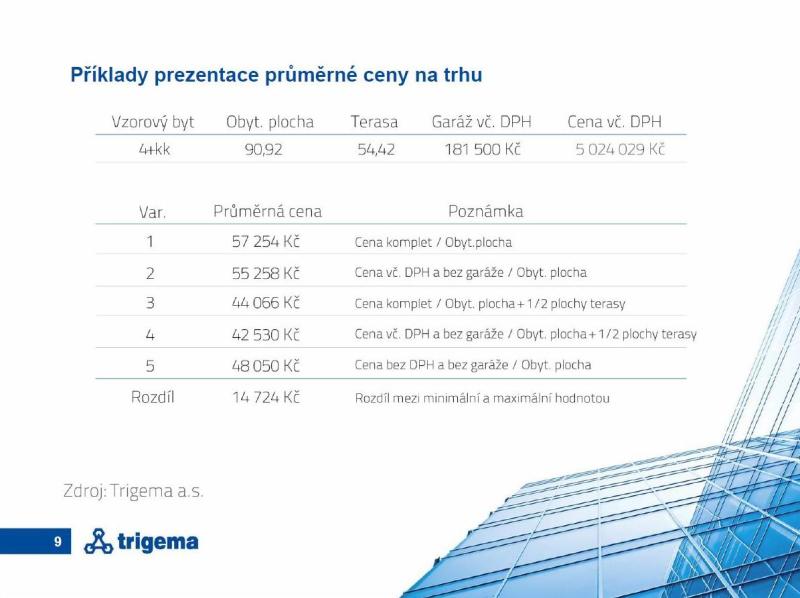 „Cena je dnes hlavně marketingovým nástrojem,“ tvrdí majitel a ředitel holdingu Trigema. Podle něj má pro kupující prodejci uváděná cena za metr bytové plochy zásadní význam a jeho názor potvrzuje i nedávný průzkum společnosti YIT. Ten na základě ankety doložil, že v celém regionu střední Evropy při pořizování bytu je cena nejsilnějším kritériem právě v Česku. Ovšem právě při jejím výpočtu různí developeři postupují hodně různě. Poměrně obehranou fintou je uvádění cen bez DPH, méně průhledné pak započítávání výměry teras a balkonů do obytné plochy (tak postupuje například Skanska, která z jejich výměry kalkuluje s jednou polovinou, což je jakýsi ohlas předpisů o výpočtu nájemného). Protipólem této praxe je naopak ignorování nákladů na nákup sklepa či garážového stání, který je ovšem velmi často obligatorní součástí celé transakce. „Nabízíme jednoduchou metodu: konečnou cenu bytu vydělit metry jeho obytné plochy, tedy nikoli například teras,“ vysvětluje M. Soural a na výpočtech dokazuje, jak z reálné ceny 57 000 za metr čtvereční bytu lze „udělat“ pouhých 42 000 Kč.
