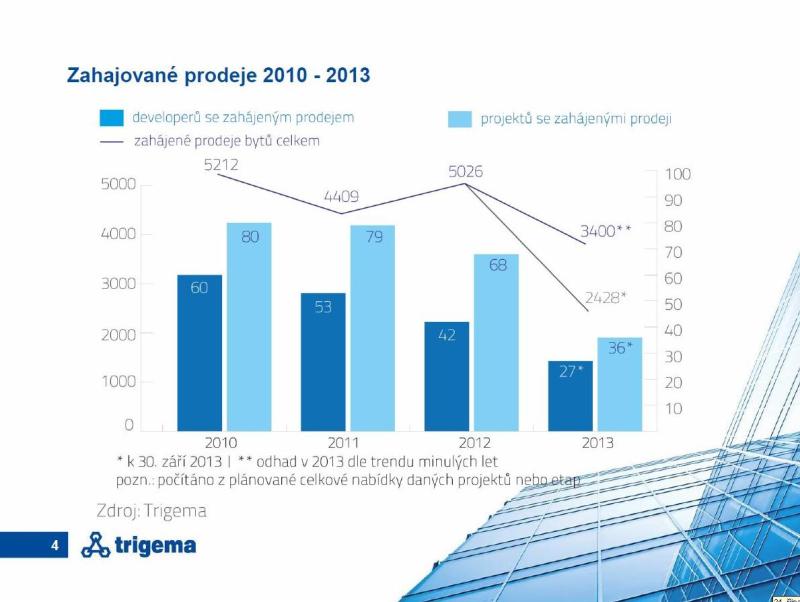 Statistiky Trigemy v posledním kvartálu tohoro roku zachytily v Praze 289 „aktivních“ bytových projektů (aktivita znamená nabídku nejméně jednoho bytu) od 162 developerských firem. Zdá se, že okruh producentů či dodavatelů je dostatečný, možná až příliš široký. Rozklíčování tohoto údaje a jeho sledování na časové ose ale přináší závěr přesně opačný. Čísla o zahajování projektů a tedy i perspektivní výstavbě jasně ukazují, že opravdu aktivních, tedy „vyrábějících“ developerů je dnes jako šafránu a číslo 162 je spíše echem někdejších zlatých časů. Letos nový projekt nabídlo jen 27 společností, když loni jich bylo 42 a v roce 2010 dokonce 60. V důsledku recese řady developerů tedy zjevně řídnou. „A pokud bychom mluvili o společnostech, které v posledních letech nový projekt nabídly každý rok, pak jich napočítáme jen devět,“ komentuje tato čísla Marcel Soural.