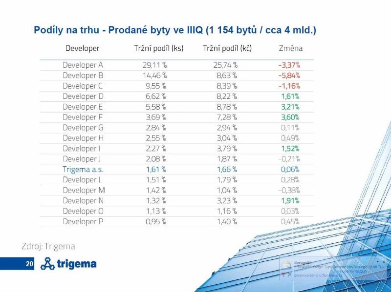 Pražský bytový trh viditelně prochází koncentrací na straně nabídky. Další údaje toto tvrzení ještě umocňují. Analytici Trigemy zmapovali tržní podíly jednotlivých firem v letošním třetím čtvrtletí, kdy bylo prodáno celkem 1 154 bytů v celkové hodnotě 4 mld. Kč. Z hlediska počtu realizovaných transakcí má největší developer (zjevně jde o Central group, jakkoli ve statistikách Trigemy není identifikován stejně jako ostatní) podíl 30 %, dvojnásobný oproti „stříbrnému“ medailistovi (14,5 %). Přitom už další největší firma nedosahuje ani na 10% podíl a jen pět developerů si z koláče realizovaných prodejů ukrojilo více než 5 %. Nejspíš objektivnější hledisko tržeb, tedy příjmů z prodeje, ovšem ukazuje, že hlavní hráč trhu s podílem 26 % svého největšího rivala (podíl 8,63 %) překonává dokonce trojnásobně. A počet firem s větším než 5% tržním podílem je jen o jednu vyšší, takže je jich celkem šest.