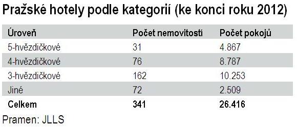 Navzdory stoupajícímu počtů zahraničních turistů, kteří Prahu navštěvují, se ceny hotelových pokojů v zásadě dlouho neměnily, v průměru se loni pohybovaly okolo 73 eur za noc. Důvodem byla vysoká konkurence, která drží ceny pod předkrizovou úrovní. „Nicméně obsazenost pražských hotelů vzrostla z 67 % v roce 2011 na loňských 69 %,“ říká Karel Klečka z Jones Lang LaSalle a dodává: „Největší návštěvnost vykazují pražské hotely na jaře, na začátku léta a na podzim, kdy se v Praze koná řada kongresů, festivalů a akcí s mezinárodní účastí.“