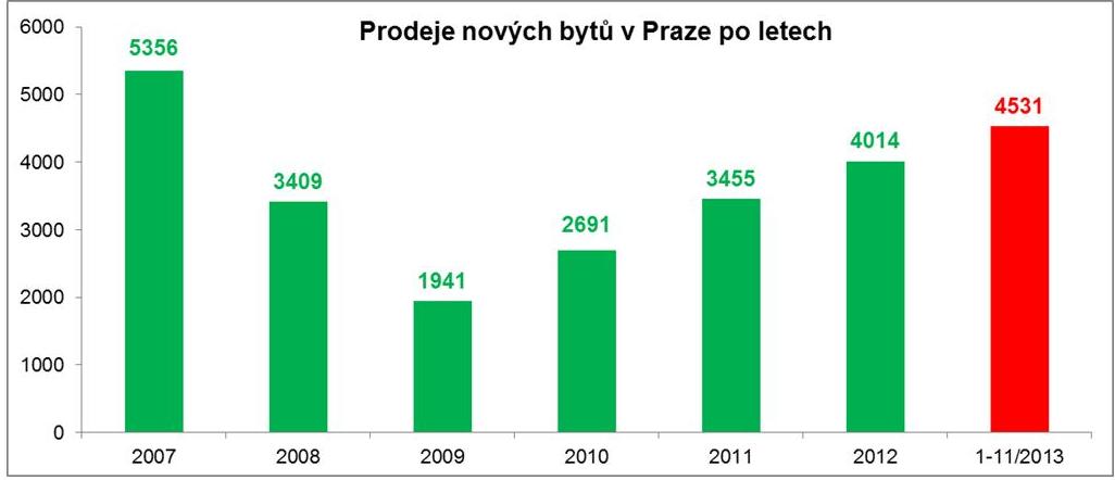 Stejně jako loni i letos došlo již během listopadu k překonání loňské hranice v prodeji nových bytů v Praze. K 30. listopadu letošního roku totiž developeři prodali již 4 531 bytů, což je o 12,9 % více, než za celý loňský rok.„I když bývá prosinec tradičně slabším měsícem, je velmi pravděpodobné, že původně predikovanou hranici 4 800 prodaných bytů letos pražští developeři překročí. A to je velmi dobrá zpráva – trh vzroste nejméně o pětinu, ale především – vzroste již čtvrtým rokem v řadě,“ pochvaluje si Evžen Korec, generální ředitel a předseda představenstva Ekospol, a dodává: „Na rozdíl od zbytku republiky vykazuje rezidenční trh v Praze všechny aspekty zdravého a racionálně fungujícího trhu, který se dokázal vyrovnat s novou cenovou realitou poměrně rychle a úspěšně.“