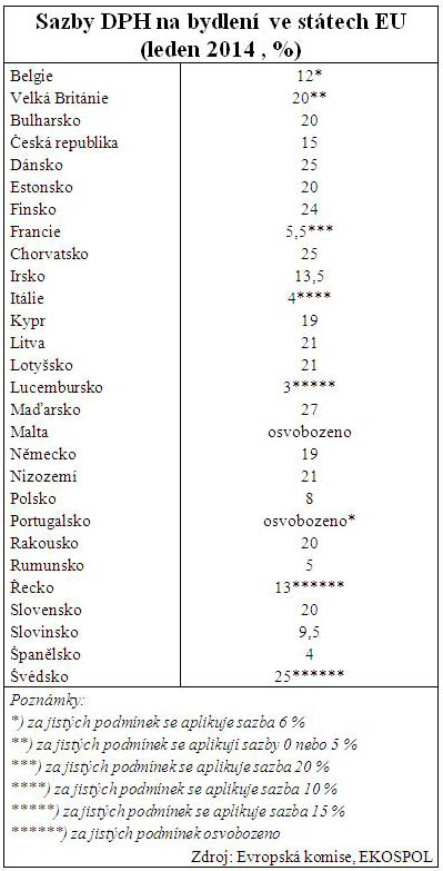 Taková nižší sazba by v rámci EU nebyla ničím neobvyklým. Například v „postkomunistické“ unijní Evropě Polsko dnes na bydlení aplikuje sazbu 8 % a Rumunsko 5 % (naopak v Chorvatsku, nejmladším členu unijní rodiny, je to 25 % a v Maďarsku 27 %), přitom ale nízké sazby lze nalézt i ve vyspělejší části Unie – třeba Francie bydlení daní sazbou daně z přidané hodnoty ve výši 5,5 %, Lucembursko (dnes daleko nejbohatší země EU) má jen 3 % a na Maltě a v Portugalsku je bydlení od daně z přidané hodnoty dokonce osvobozeno.