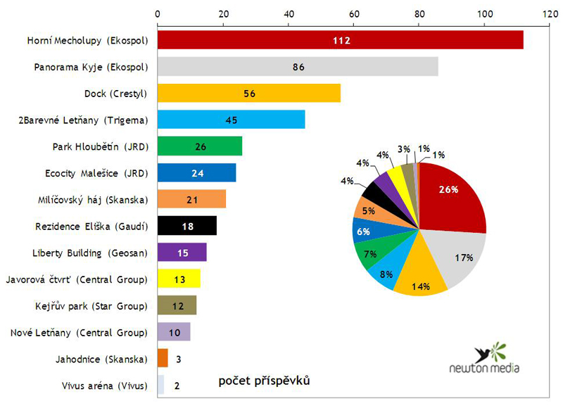Graf seznamuje s objemem publicity vybraných developerských projektů v českých médiích (bez agenturního zpravodajství) a uvádí jejich podíl na celkové mediální ploše.