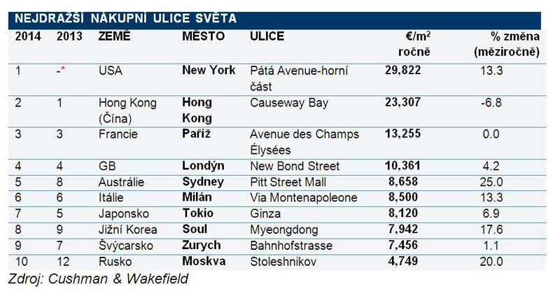 Pařížská Champs-Élysées si udržela třetí místo (13 255 eur za m2/rok). Nájmy zde byly v posledním roce stabilní, zatímco o rok dříve vyskočily o 40 procent. Za Paříží se drží londýnská New Bond Street, kde došlo k růstu nájemného o čtyři procenta. Top pětku uzavírá Pitt Street Mall v Sydney.