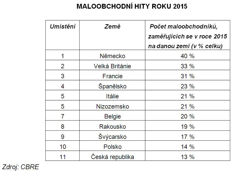 Česká republika je pro globální maloobchodní společnosti či značky jedenáctou nejatraktivnější zemí – vyplývá to z výsledků nejnovějšího průzkumu poradenské společnosti CBRE „How active are retailers“. Zmíněná 11. příčka se ovšem týká evropského měřítka, pokud se na Českou republiku hledí optikou celého světa, drží se nicméně na stejně důstojném 17. místě. Zájem obchodníků přitom koresponduje s poptávkou investorskou, kterým český „retail“ nyní přijde také nanejvýš atraktivní. Samotný český maloobchod ve svém celku ovšem – možná trochu paradoxně – jisté potíže se svou kondicí má.