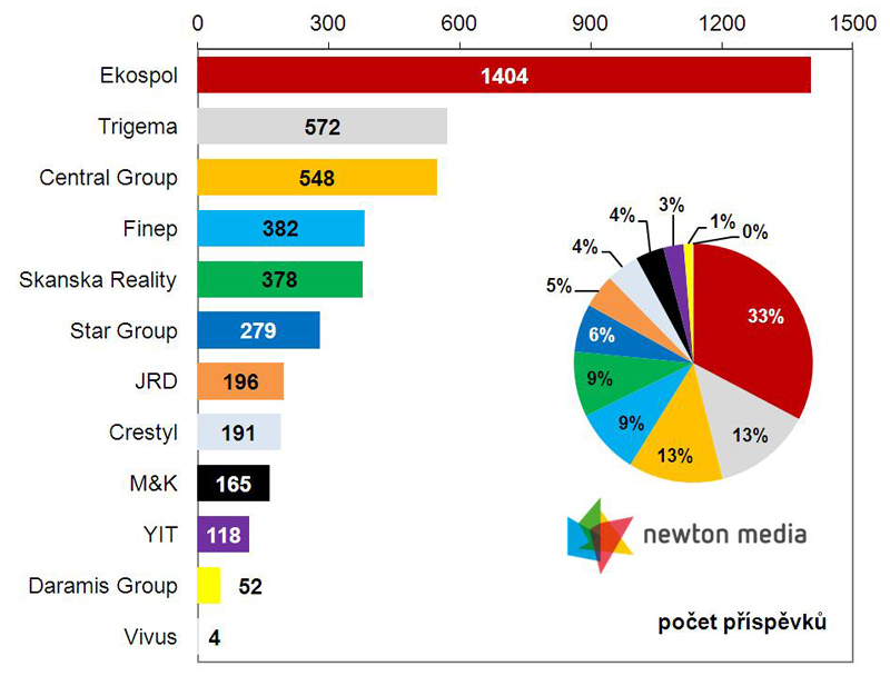 Od poslední sondy společnosti Newton Media do mediálního života tuzemských developerů uplynul právě rok. Leccos se od té doby změnilo. Pojďme se na to podívat a vezměme to od větších ryb k těm menším. Tou největší je bezesporu pražská developerská společnost Ekospol – ta si na mediální scéně dominantní pozici zjednala už v předchozích letech a loni ji ještě mocně podtrhla, když si připsala bezmála trojnásobný objem publicity (1 404 příspěvků) než kvarteto jejích největších konkurentů.