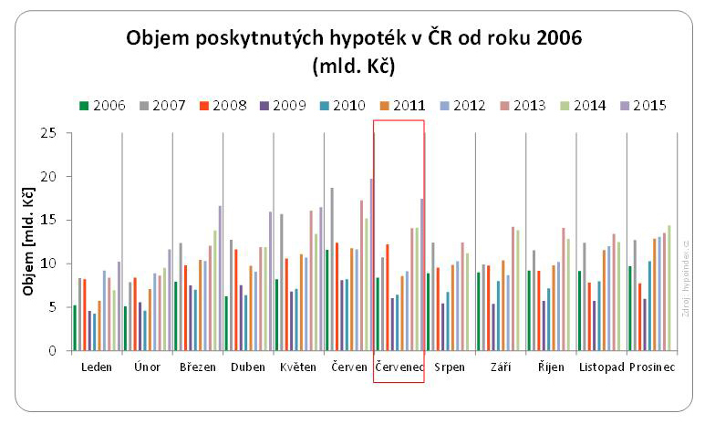 Banky v červenci tohoto roku poskytly hypoteční úvěry v hodnotě 17,44 mld. Kč. Po červnových 19,7 miliardách se sice jedná o meziměsíční „propad“, ale v porovnání se stejným obdobím loňského roku celková suma sjednaných hypoték vzrostla o bezmála tři miliardy, což znamená nárůst o 24 % – v historickém žebříčku nejúspěšnějších měsíců se letošní červenec současně zařadil na 3. příčku. Kromě letošního června, který se absolutně vymyká předchozím výsledkům, více peněz banky během jediného měsíce rozpůjčovaly pouze v červnu 2007. Tehdy to bylo 18,7 mld. Kč.