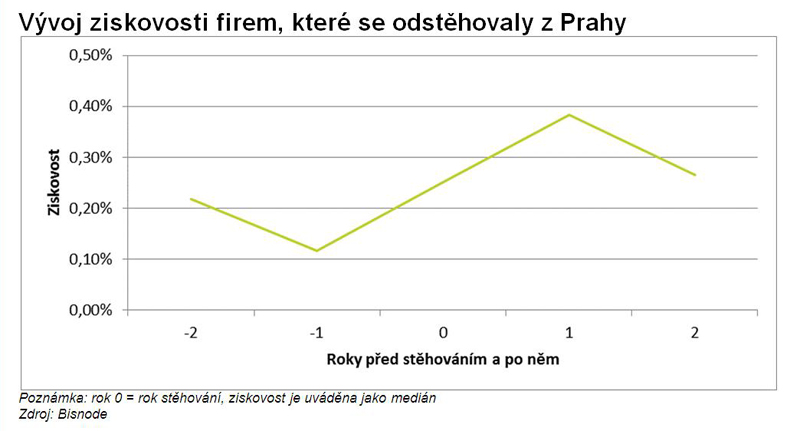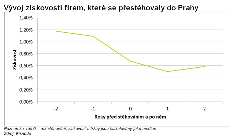 Firmám, které se přestěhovaly do Prahy, výrazně klesla ziskovost a vzrostly tržby. Naopak společnostem, které z hlavního města přesídlily mimo něj, se ziskovost zvýšila. Společnost Bisnode analyzovala vzorek 1 843 společností, které se mezi lety 2006 až 2012 přestěhovaly do Prahy, u nichž jsou k dispozici finanční výkazy z doby před i po stěhování. „Již v roce stěhování dochází k prudkému poklesu ziskovosti (poznámka: poměr čistého zisku vůči obratu) z hodnot převyšujících jedno procento na 0,7 %. V dalším roce pokles ziskovosti pokračuje mírnějším tempem, nicméně ziskovost firem je dva roky po přestěhování do Prahy poloviční oproti hodnotě před ním,“ komentuje výsledky analytik Bisnode Milan Petrák s tím, že v kontrastu s tím se obrat těchto firem ve sledovaném období mírně zvýšil.