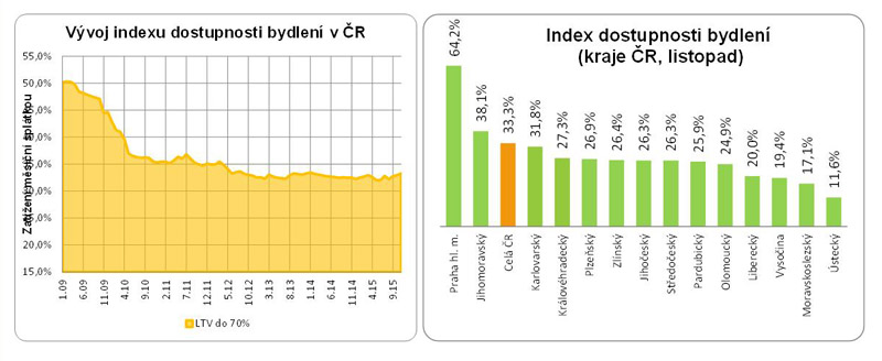 Přes víceméně permanentní snižování ceny hypotečních peněz se bydlení v ČR v listopadu zdražilo, na čemž mají zásluhu hlavně stoupající ceny rezidenčních nemovitostí. Index dostupnosti bydlení, který poměřuje výši měsíční splátky hypotéky s průměrným příjmem domácnosti, v listopadu vzrostl z 32,9 na 33,2 %. Jinými slovy: průměrná česká domácnost v současnosti vynakládá na splátku hypotečního úvěru zhruba 1/3 svých čistých příjmů. Jiná je však situace v hlavním městě, kde při průměrné ceně bytu 4,55 mil. Kč dosahuje index hodnoty 64 % průměrného příjmu domácnosti. A zase jinak je to v ostatních krajích, kde kromě Jihomoravského kraje je míra dostupnosti nižší než zmiňovaný průměr.