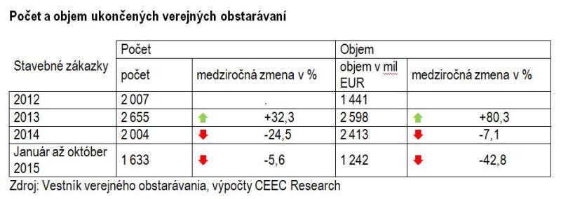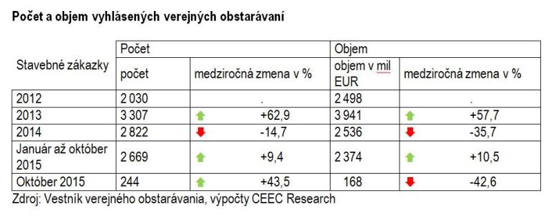 Investori vyhlásili v októbri verejné obstarávania na stavebné práce v celkovej hodnote 168 miliónov EUR, čo je objem znateľne pod dlhodobým priemerom (priemer v období 1/2012 – 10/2015 predstavuje 247 miliónov EUR). Od začiatku tohto roka našli stavebné firmy vo Vestníku verejného obstarávania práce v celkovej hodnote 2,4 miliardy EUR, pričom v systéme obstarávania zostáva ešte k vyčerpaniu 1,8 miliardy EUR. Vyplýva to z najnovšej analýzy analytickej spoločnosti CEEC Research vypočítanej na základe údajov poskytnutých Úradom pre verejné obstarávanie ku koncu októbra 2015.