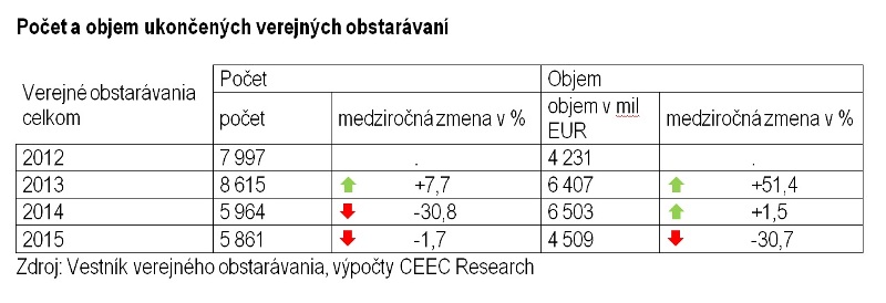 V roku 2015 vyhlásili investori celkom 7 331 obstarávaní, čo predstavuje rekordne najnižší ročný počet za posledné štyri roky, teda za sledované obdobie ( 8 916 v roku 2012, 9 919 v roku 2013, 8 064 v roku 2014). Oproti tomu objem investícií dosiahol v celkovej hodnote 7,7 miliardy EUR a medziročne tak vzrástol o 15,7 percenta. Aktivita investorov bola v počte ukončených verejných obstarávaní na rovnakej úrovni ako v predchádzajúcom roku, avšak ich celková hodnota zaznamenala výrazný tretinový pokles. Vyplýva to z najnovšej analýzy spracovanej analytickou spoločnosťou CEEC Research na základe údajov poskytnutých Úradom pre verejné obstarávanie ku koncu decembra 2015.