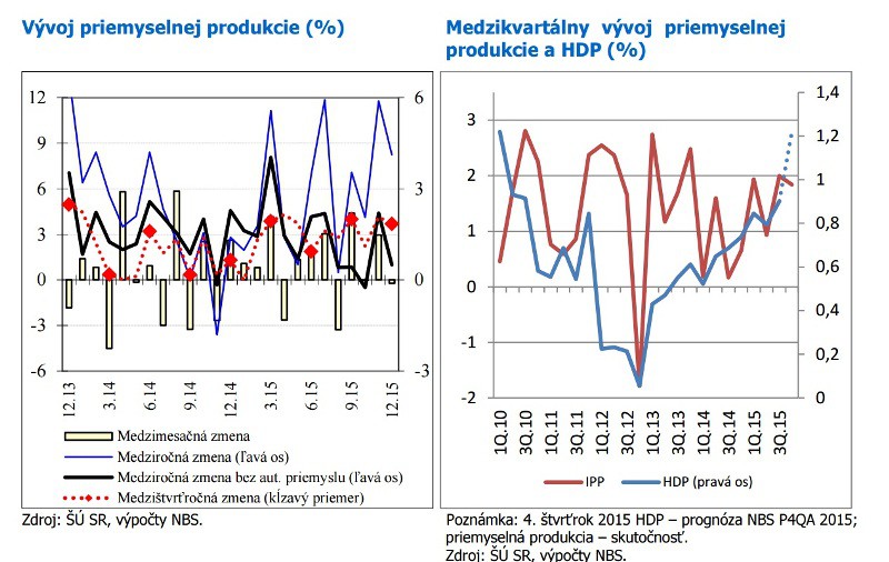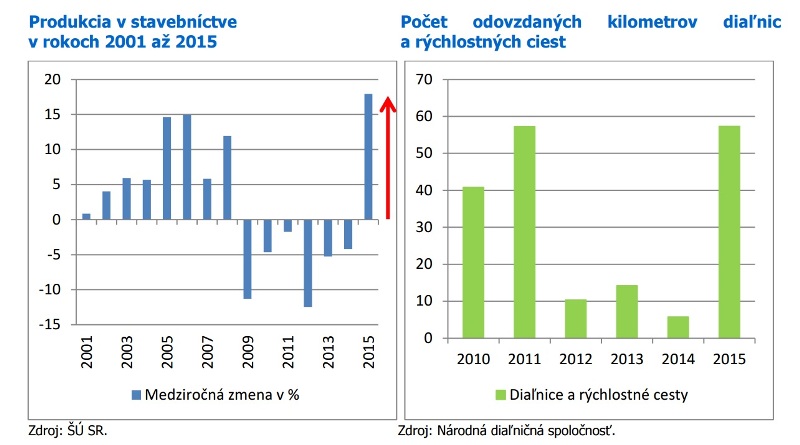 Rok 2015 bol veľmi priaznivý. Koncoročné odstávky spomalili decembrový priemysel (autá, hutníctvo), avšak za rok ako celok sa mu darilo (rast o 5,9%). Priaznivý vývoj by mal pokračovať (pozitívum je aj zrušenie skráteného pracovného týždňa v hutníctve). Stavebná produkcia po šiestich rokoch poklesu vzrástla o takmer 18 %. Darilo sa jej najmä kvôli výstavbe nových ciest a diaľnic (bez vplyvu novej infraštruktúry, financovanej najmä z eurofondov, by stavebníctvo vzrástlo v minulom roku o 3,5%).