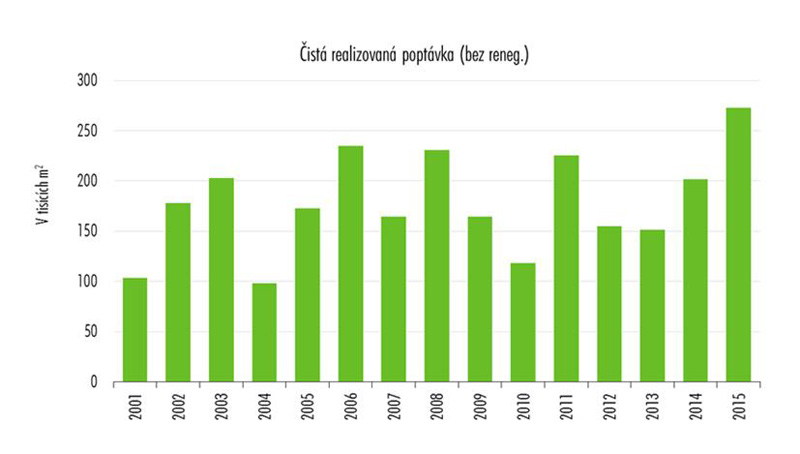 Výhodné podmínky pro nájemce se pozitivně odráží i na stavu celého trhu. Jak ukazuje graf, loni byla čistá poptávka rekordně vysoká – dosažených 273 000 m2 kromě historického maxima představovalo také meziroční zvýšení „odbytu“ nových kanceláří o 37 % a v porovnání s lety 2012 – 2013 dokonce o více než 80 %.