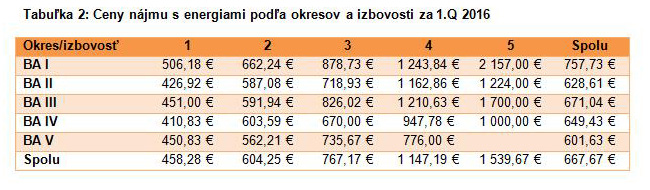 Tabuľka 2: Ceny nájmu s energiami podľa okresov a izbovosti za 1.Q 2016