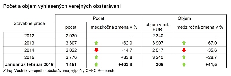 V období od januára do februára 2016 vyhlásili investori 1 451 verejných obstarávaní na stavebné práce v celkovej hodnote 306 miliónov EUR. To predstavuje vôbec najvyšší počet v prvých dvoch mesiacoch za posledné štyri roky, teda za sledované obdobie. Ide však prevažne o malé zákazky. Pokračuje tiež zvýšená aktivita investorov v ukončovaní verejných obstarávaní. Konkrétnym stavebným firmám bolo zadaných 401 zákaziek v celkovej hodnote 153 miliónov EUR. Vyplýva to z najnovšej analýzy spracovanej analytickou spoločnosťou CEEC Research na základe údajov poskytnutých Úradom pre verejné obstarávanie ku koncu februára 2016.