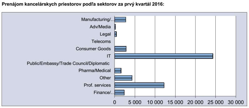 V 1. kvartáli 2016 bola najväčšia zaznamenaná transakcia na trhu prenájmu kancelárskych priestorov vo výmere 10 086 m². Okrem tejto transakcie boli zaznamenané ešte tri ďalšie, ktoré presiahli výmeru 2 000 m² a sedem transakcií s veľkosťou 1 000 – 2 000 m² . V prvom kvartáli roka 2016 dominovali na trhu transakcie spoločností z IT sektora (47,6%) nasledované spoločnosťami zo sektora profesionálnych služieb (24%).