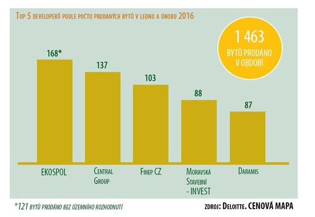 Firma Central Group prodala za 1. čtvrtletí 259 bytů, což je 16,2 % všech prodaných nových bytů v Praze a společnost tím jako jediný hráč na trhu překročil desetiprocentní podíl na prodeji. S více než stovkou prodaných bytů (s podílem 9,2 %, respektive 8,8 %) následují Skanska Reality a FINEP. Žádná z dalších developerských firem v Praze nepřekročila hranici 100 prodaných bytů.