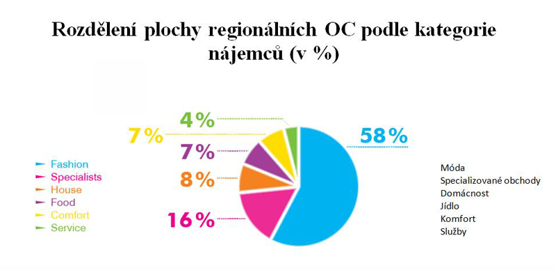 V regionálních OC prodeji dominuje móda – ta se na jejich ploše podílí 58 %, na celkovém počtu obchodních jednotek 42 %. Byl to však jediný sektor, který vykázal pokles počtu jednotek. Naopak nejvyšší nárůst prodejen, meziročně téměř 10 %, byl zaznamenán v sektoru pro domácnost a ve specializovaných obchodech a také potravin a služeb.