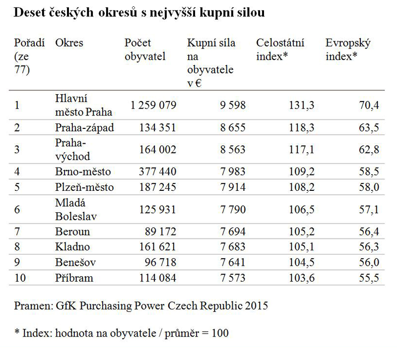 Podobně dopadá komparace kupní síly v metropoli a v regionech. V Praze, která je nejbohatším městem v zemi, dosahuje 9 598 eur (260 000 Kč) na obyvatele a pohybuje se tak 31 % nad celostátním průměrem. Českému průměru se přitom nejvíc blíží okres Plzeň-sever, jehož obyvatelé mají k dispozici 210 000 Kč na osobu. Na opačném konci žebříčku koupěschopnosti jednotlivých českých regionů je Bruntál, kde činí kupní síla pouze 160 000 Kč na obyvatele. Tato hodnota zaostává za celostátním průměrem o 18 % a zároveň přibližně odpovídá kupní síle populace Chorvatska.