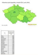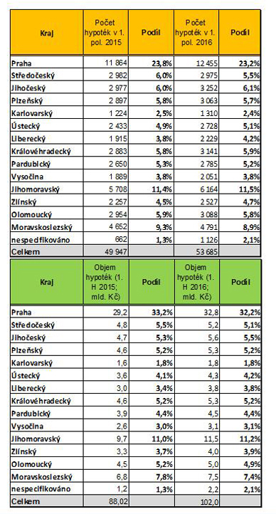 Na podílech v celkovém objemu sjednávaných hypoték se projevuje rozdílná výše úvěrů sjednávaných v jednotlivých regionech. Zatímco v Praze si lidé v prvním pololetí půjčovali v průměru 2,64 mil. Kč, v Karlovarském kraji, který stojí na opačném konci tohoto srovnání, činila průměrná půjčená částka 1,38 milionu. V celkových objemech se tato disproporce projevuje tím, že zatímco na počtu sjednaných hypoték se Praha podílela „jen“ 23 %, v objemech její podíl činí více než 32 %. V horních patrech žebříčku krajů s nejvyšší průměrnou výší hypotéky se podle očekávání pohybuje také Jihomoravský kraj, kde se odrážejí vyšší ceny nemovitostí v Brně a blízkém okolí a Středočeský kraj – tady se na vyšších průměrných částkách pravděpodobně podepisuje větší zastoupení výstavby rodinných domů.
