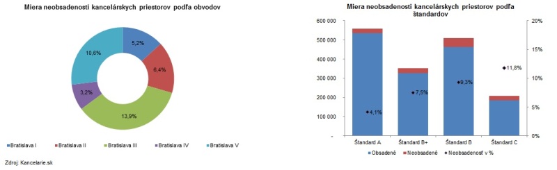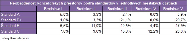 V druhom štvrťroku dosiahla celková miera neobsadenosti v Bratislave 121 700 m2; čo v percentuálnom vyjadrení predstavuje 7,5% z celkovej výmery kancelárskych priestorov v Bratislave, a zároveň je to i pokles oproti minulému štvrťroku o 0,8 %. S miernym poklesom o 0,5 %, ale naďalej s najvyššou neobsadenosťou vedie mestská časť Bratislava III (13,9 %), nasleduje Bratislava V (10,6 %) a Bratislava II (6,4 %). Najvyššia miera neobsadenosti kancelárskych priestorov podľa štandardov je v štandarde C (11,8 %), ktorý v tomto ukazovateli predstihol i kancelárie štandardu B (9,2 %). Tieto oproti minulému štvrťroku vykázali pokles o 1,1 % a dostali sa tak pod hranicu 10 %. Za „béčkovými“ kanceláriami nasledujú kancelárie štandardu B+ s neobsadenosťou na úrovni 7,5 %.