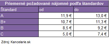 Priemerná požadovaná výška nájmu voľných kancelárskych priestorov v Bratislave je bez prekvapenia stabilná. Jedinou zmenou oproti prvému štvrťroku je tak iba pokles spodnej hranice nájomného pri štandarde C, kde zo 6,9 € m2/ mesiac klesla suma na 5,0 € m2/ mesiac.