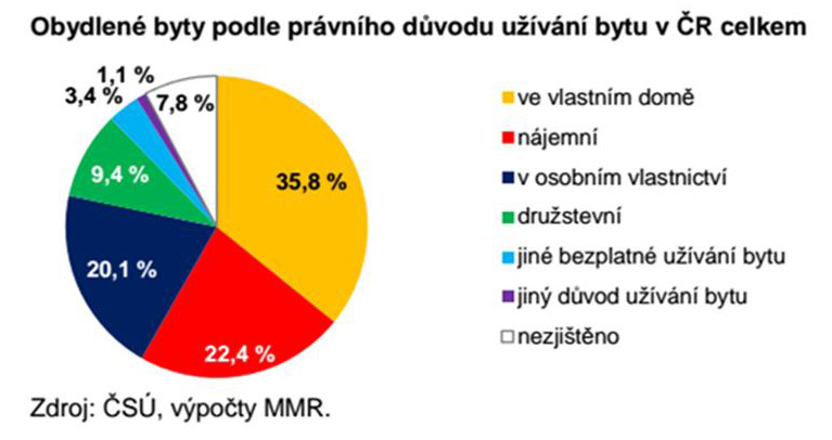 Téměř 56 % bytů bylo podle posledního sčítání užíváno jejich vlastníky nebo lidmi vlastnícími přímo dům, ve kterém se byt nachází (tj. bezmála 2 300 00 bytů). Nájemníci pak obývali zhruba 22 % všech obydlených bytů (tj. přibližně 920 tisíc). Přes 9 % bytového fondu v Česku pak tvořily byty družstevní a necelá 3,5 % užívají lidé bezplatně, tj. jedná se například o bydlení v bytě některého z příbuzných apod.