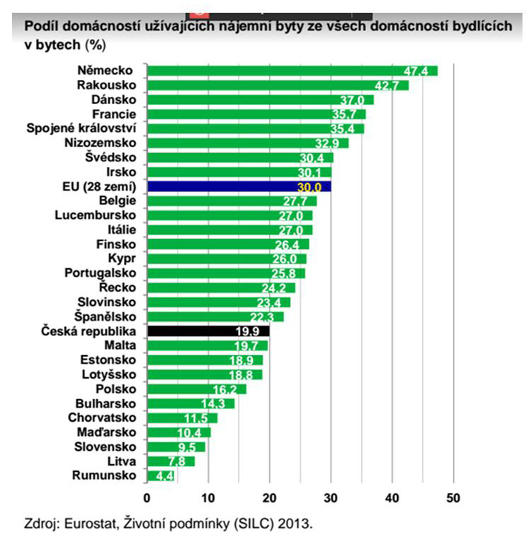 Podíl domácností užívajících nájemní byty klesl od posledního sčítání do roku 2015 o další zhruba dvě procenta a tvořil 19,9 % ze všech domácností. V porovnání se zbytkem Evropské unie jde spíše o nižší podíl. Nejvíce nájemních bytů bychom našli v zemích s rozvinutým sociálním systémem – například v Německu, kde v nich žije téměř polovina všech domácností, nebo v sousedním Rakousku. Následovaly by Dánsko, Francie nebo Velká Británie. Naopak nejmenší podíl nájemních bytů má v Unii Rumunsko (jen něco málo přes 4 %) nebo Litva (zhruba 8 %). Méně nájemníků než Česko mají i všechny zbývající země V4 – nejméně pak Slovensko (přibližně 9,5 % všech domácností).