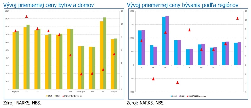 Pre 3. štvrťrok 2016 je charakteristický pretrvávajúci dynamický rast priemernej ceny bytov (medziročne o 9 % z 8,2 % v 2. štvrťroku) a spomalenie rastu priemernej ceny domov (o 2 % z 2,2 % v 2. štvrťroku). Medziročne najvýraznejšie vzrástla priemerná cena jednoizbových bytov (o vyše 11 %) a najpomalšie priemerná cena päťizbových bytov (o zhruba 5 %).