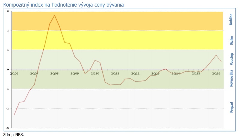 Vývoj hodnôt kompozitného indexu vyplnil v doterajšej histórii slovenského realitného trhu všetky zvýraznené škály, t. j. od prepadu až po cenovú realitnú bublinu. Aktuálne sa hodnota kompozitného indexu na hodnotenie vývoja ceny bývania nachádza v pásme vzostupu. Stále však je pod pásmom rizikového vývoja a relatívne ďaleko od pásma realitnej cenovej bubliny. Pokračujúci rast ekonomickej výkonnosti a snaha domácností ešte využiť relatívne priaznivé úverové podmienky vytvárajú predpoklady pre pokračovanie rastu agregovanej ceny nehnuteľností na bývanie aj v posledných mesiacoch roku 2016.