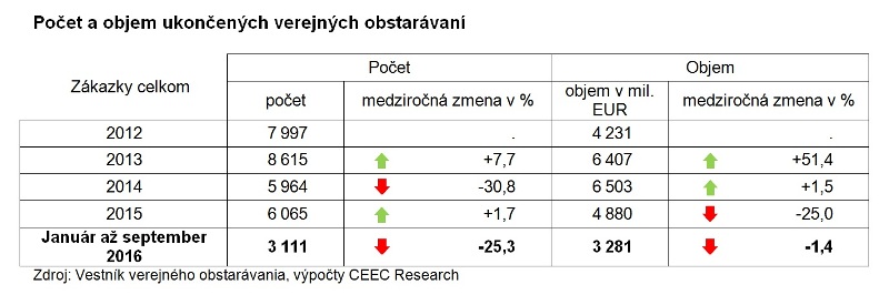 Od januára do septembra tohto roka vyhlásili investori 4 236 verejných obstarávaní v celkovej hodnote 3,6 miliardy EUR, čo predstavuje najmenší objem investícií za posledné štyri roky. Aktivita investorov v ukončovaní verejných obstarávaní vykazuje rovnako dlhodobo zápornú bilanciu, pričom zákaziek bolo doposiaľ firmám zadaných o štvrtinu menej než vlani. Vyplýva to z najnovšej analýzy spracovanej analytickou spoločnosťou CEEC Research na základe údajov poskytnutých Úradom pre verejné obstarávanie ku koncu septembra 2016.