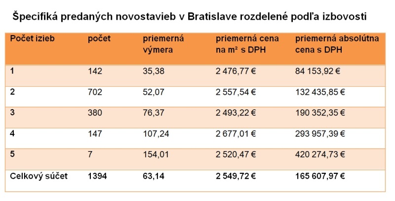 Z hľadiska izbovosti najväčší záujem bol o dvojizbové byty, ktoré s predajom 702 jednotiek tvorili vyše 50% z celkového predaja novostavieb v Bratislave. Zvýšený predaj takisto zaznamenali trojizbové byty, ktorých spotrebitelia oproti predchádzajúcemu kvartálu kúpili až o 60% viac. Prepad predaja sme zaznamenali pri jednoizbových bytoch (-30%) ktorých nové projekty do ponuky vo väčšej miere nezaradili.