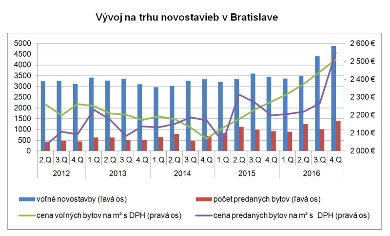 Koniec roka 2016 priniesol pre bratislavský realitný trh ďalšie zvýšenie aktivity na strane dopytu a aj ponuky. Nadmieru vysoký dopyt bol vyvolaný ponukou, keď bratislavský realitný trh za posledných 6 mesiacov zaplavilo množstvo novostavieb. Bohatá ponuka, najmä v lokalitách bližšie k centru mesta ukázala, že po takýchto bytoch je veľký záujem. Ku zvýšenej ponuke sa pridávajú rastúce mzdy obyvateľstva, rekordne nízke úrokové sadzby, klesajúca nezamestnanosť a celková expanzia Slovenskej ekonomiky (cítiteľná najmä v Bratislave) čo všetko spôsobuje kvartálny dopyt prevyšujúci 1000 bytov. Ďalšie faktory vysokého dopytu sú ešte rýchly cenový rast na čo spotrebitelia reagujú vôľou kúpiť byt čo najskôr, kým je ešte „lacný“. Zvýšené reštrikcie komerčných bánk, ktoré už nebudú poskytovať 100%-né úvery takisto v spotrebiteľoch vyvolávajú potrebu kúpiť byt čo najskôr. Práve absencia týchto dvoch faktorov môže v blízkej budúcnosti vyvolať mierne ochladenie dopytu a s ním aj zmiernenie cenového rastu.
