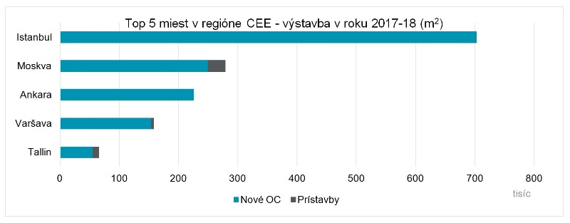 Turecko má naplánovanú najrozsiahlejšiu výstavbu, čo sa týka Európy pre rok 2017 až 2018, pričom objem plánovanej výstavby predstavuje 1,55 milióna m2. Napriek očakávanému zvýšeniu množstva projektov sú plány pozastavené kvôli politickým a ekonomickým rizikám. Rusko sa radí na druhú priečku vzhľadom na pripravenosť na výstavbu v regióne CEE s objemom výstavby 1,46 milióna m2 a kľúčové projekty zahŕňajú otvorenie nákupného centra s plochou 120 000 m2 s názvom Vegas III v Moskve a prístavbou 107 000 m2 nákupného centra Evropa v meste Kursk. V Poľsku sa v rokoch 2017 až 2018 očakáva výstavba 546 000 m2 nových nákupných priestorov, čo je tretí najväčší objem výstavby v regióne CEE.