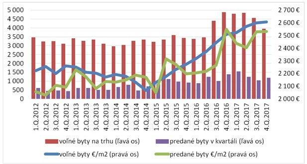 Celkovo sa za celý rok 2017 predalo v bratislavských novostavbách 5020 bytov, čo predstavuje 13,75 bytu na každý deň. Ponuka voľných bytov sa drží za celý minulý rok v priemere 4500 bytov čo znamená, že pri zachovanom dopyte by táto ponuka uspokojila trh na najbližší rok. Dokončených bola v ponuke na konci roka pätina voľných bytov. Z tých predaných bolo dokončených len 15 %.