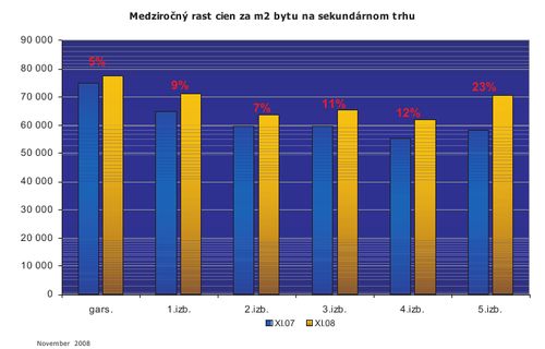 „V porovnaní s prvým polrokom 2008 sa priemerná cena novostavieb príliš nezmenila,“ podotýka správa spoločnosti Lexxus. Ak neberieme do úvahy projekty zaradené do luxusného segmentu, priemerná cena bytov, ktoré prišli na trh v druhej polovici roku 2008, bola niečo vyše 63 000 Sk (€ 2091, 22) za m2 bez DPH. Najlacnejšie sú dnes v Podunajských Biskupiciach, kde sa m2 predáva už od 36 000 Sk (€ 1194,98) bez DPH, a v Dúbravke s cenou od 39 000 Sk (€ 1294,56) bez DPH. Napriek klesajúcemu trendu je sekundárny trh so starými bytmi stále drahší ako v roku 2007 a v medziročnom porovnaní vykazuje opäť nárast. Najväčší – čo sa lokality týka – zažila mestská časť Bratislava 4 (26%), najmenší Bratislava 1 (4%).