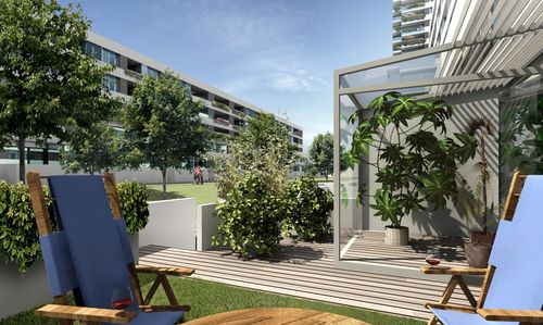 Mestotvornosť projektu zvýrazní obchodný parter orientovaný do Račianskej ulice. Budovy tu totiž okrem prízemných bytov prinesú ďalší rozmer: občiansku vybavenosť v podobe obchodov a služieb, ktorá sa rozloží na ploche 5-tisíc m2 a výrazne dotvorí tie funkcie, ktoré tu dosiaľ chýbali. A ešte niečo – mezonety s predzáhradkami, netradične navrhnuté na spodných podlažiach. Vo vnútornom areáli medzi obytnými domami vznikne nádvorie s plnohodnotnou oddychovo-relaxačnou funkciou. Dvojpodlažná podzemná garáž s kapacitou okolo 500 parkovacích miest sa jeho prostriedku vyhne, čo umožní vysadiť na povrchu plnohodnotnú kombináciu mestského parku a záhrady na verejne prístupnej ploche takmer 5 900 m2.