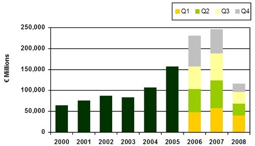 Kontrast medzi 3. a 4. kvartálom silno ovplyvnil aj kolaps americkej investičnej banky Lehman Brothers a prehlbovanie úverového chaosu, čo malo negatívny dopad na dôveru investorov. Tým, že úverová kríza si vyžiadala svoju daň na ekonomike, mnohé európske krajiny skĺzli do negatívnej prognostiky hospodárskeho rastu. Hoci investičné aktivity v Európe poklesli v poslednom kvartáli v porovnaní s tretím o 29 percent, tento výsledok nezachytáva niekoľko významných transakcií v úhrnnej výške 1,65 miliardy eur tesne pred koncoročnou uzávierkou.