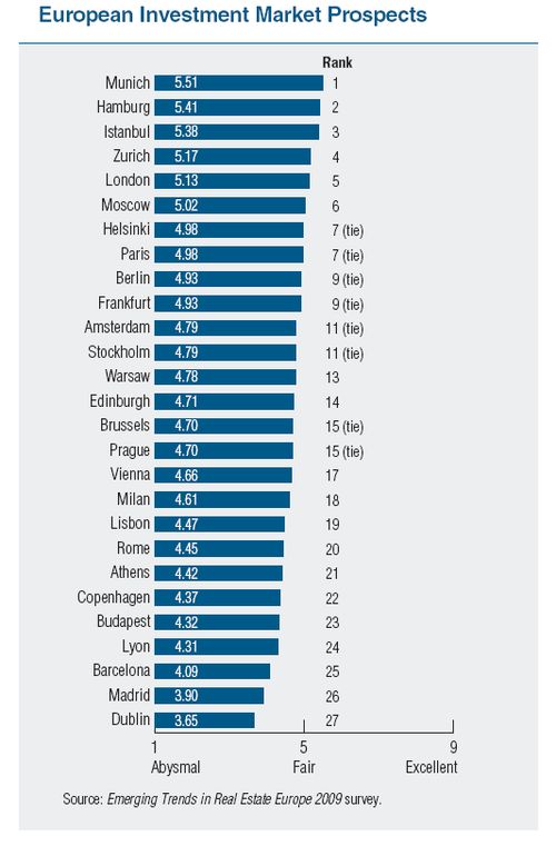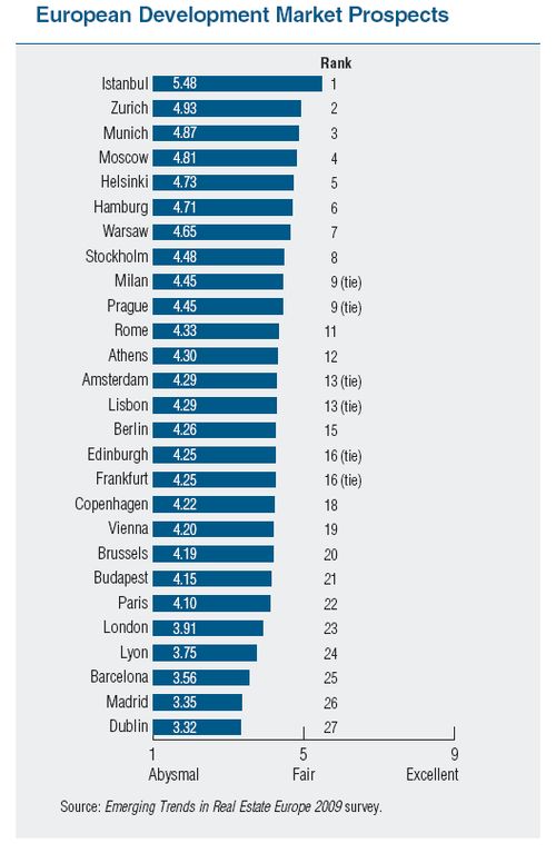 Podľa štúdie Emerging Trends in Real Estate ® Europe 2009 kleslo hodnotenie investičných a developerských príležitostí pre všetky sledované mestá. Indikátor investičných príležitostí poklesol z 5,6 (skôr dobré) v roku 2008 na 4,7 (prijateľné) v roku 2009. Developerské príležitosti poklesli ešte viac – z 5,6 na 4,3 (skôr zlé).