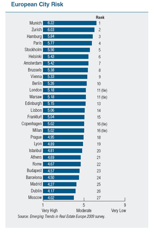 Jedným z cieľov štúdie bolo identifikovať najatraktívnejšie a zároveň najbezpečnejšie miesta na investície do realít. Moskva a Istanbul – vlaňajší lídri rebríčka – prenechali tentoraz svoje pozície Mníchovu a Hamburgu, ktoré poskytujú relatívne bezpečnejšie podnikateľské prostredie. Mníchov je vďaka svojej ekonomickej základni vnímaný ako málo rizikový realitný trh. Nemecko všeobecne disponuje najväčším podielom dlhodobých investorov, čo pomohlo Hamburgu k druhému miestu a Frankfurtu či Berlínu k ich umiestneniu v prvej desiatke.