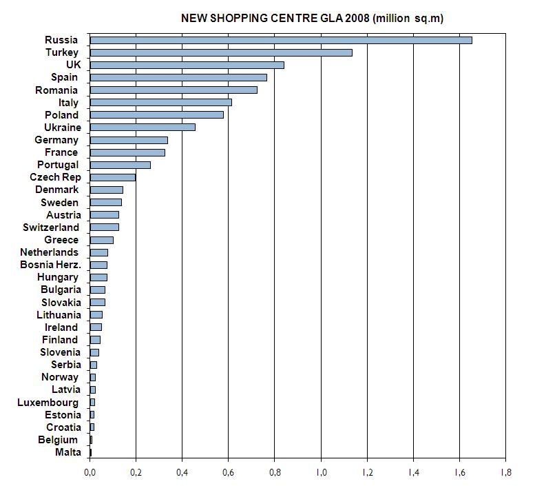 310 nákupných centier na čele s Ruskom (1,65 miliónov m2), po ktorom