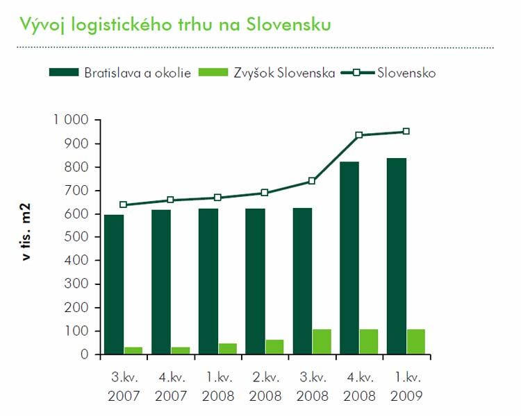 Plocha moderných skladových priestorov na Slovensku dosiahla hodnotu 950 295 m2. Približne 88 percent z nich (838 278 m2) je situovaných v bratislavskom regióne, z toho prevažná časť popri diaľniciach D1 a D2, a mimo širšieho okolia metropoly len 112 000 m2. Podobne objem 34 200 m2 novovytvorených logistických priestorov, ktoré od januára do marca 2009 obohatili domáci trh, naznačuje síce medziročný nárast o 140 percent, no oproti poslednému kvartálu 2008 zároveň signalizuje až 83-percentný prepad!