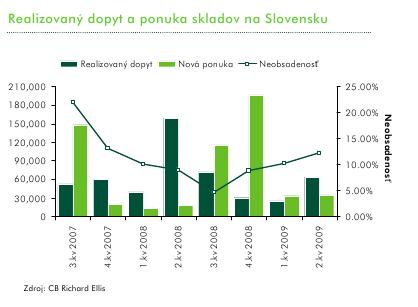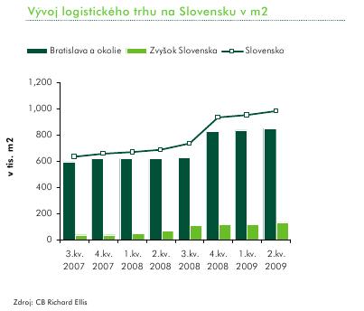Na celkovom objeme skladových priestorov na Slovensku 984,345 m2 ku koncu 1. štvrťroku 2009 zaujme ich 84-percentný podiel v Bratislave a priľahlom okolí (849 828 m2), prevažne umiestnených popri diaľniciach D1 a D2. Mimo širšieho okolia metropoly ich je 134 517 m2. Spomalenie realizácie nových transakcií sa premietlo do zvýšenej miery neobsadenosti na 12,31% (medzikvartálny nárast o 2,1%).