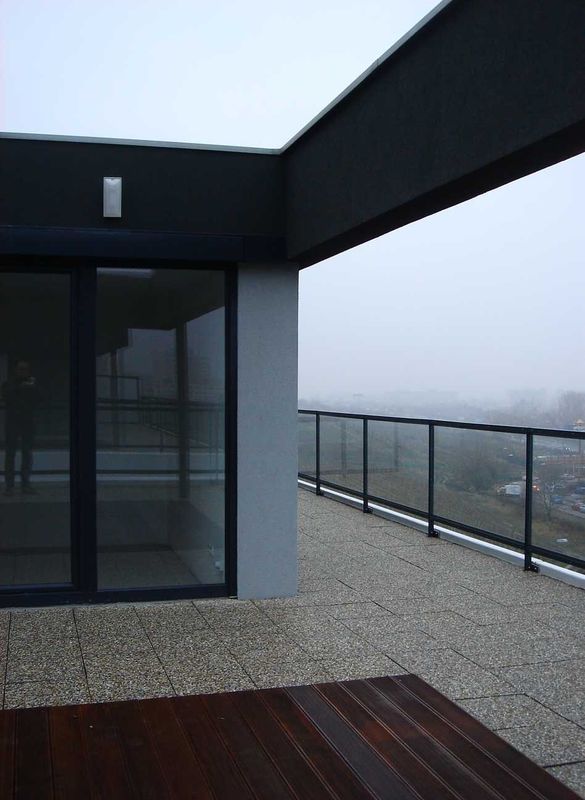 (presklené steny) na oboch pozdĺžnych fasádach, tak ako aj loggie.