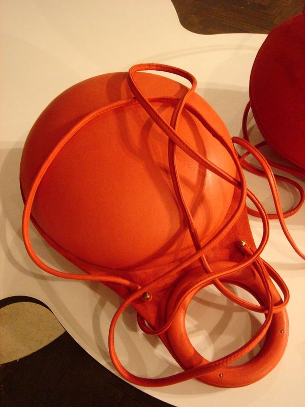 nazberaného a plisovaného červeného saténu. Tvarom i materiálom mu vo