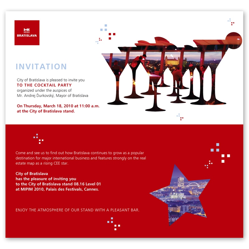 Pre návštevníkov MIPIM 2010 je na štvrtok 18. marca o 11. hodine pripravená v bratislavskom stánku 08.16, Level 01, Palais des Festivals oficiálna koktejl party (obrázok 6), ktorá sa bude konať v prítomnosti primátora Bratislavy Andreja Ďurkovského a riaditeľky mestského magistrátu Anny Pavlovičovej. Tu bude možné diskutovať o všetkých prezentovaných projektoch, o súčasnom stave územného rozvoja, aktualizácie územného plánu, ako aj o ekonomickej situácii Bratislavy.