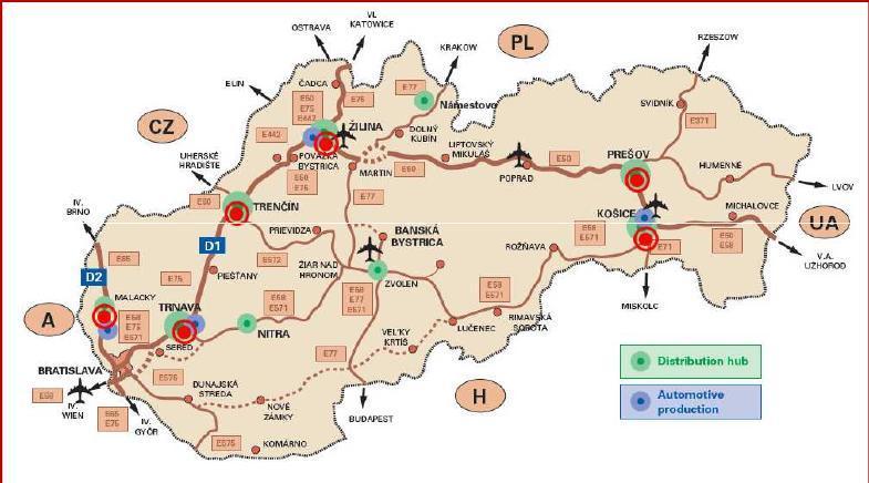 Mapka 1 (CBRE) – Logistické „hot spoty“ na Slovensku